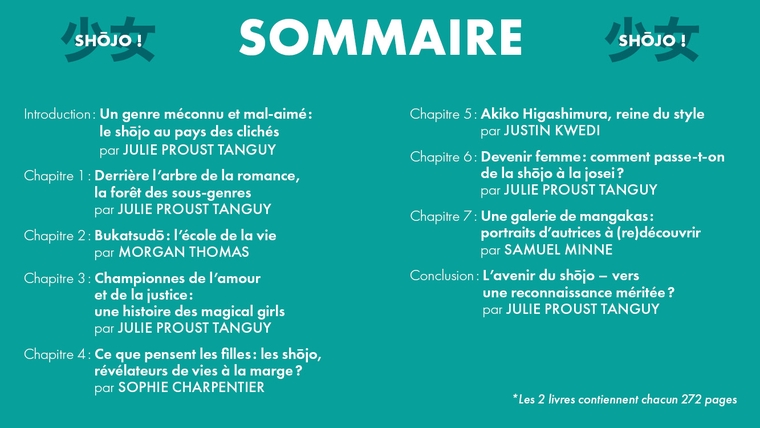 Ce panorama vise à mettre en avant toute la diversité du shōjo, afin de faire (re)découvrir les œuvres et les mangakas qui le font vivre. En variant approches historiques, thématiques et biographiques, ce beau livre permettra aux lectrices et aux lecteurs de renouveler leur vision d’une des catégories-phares du manga.